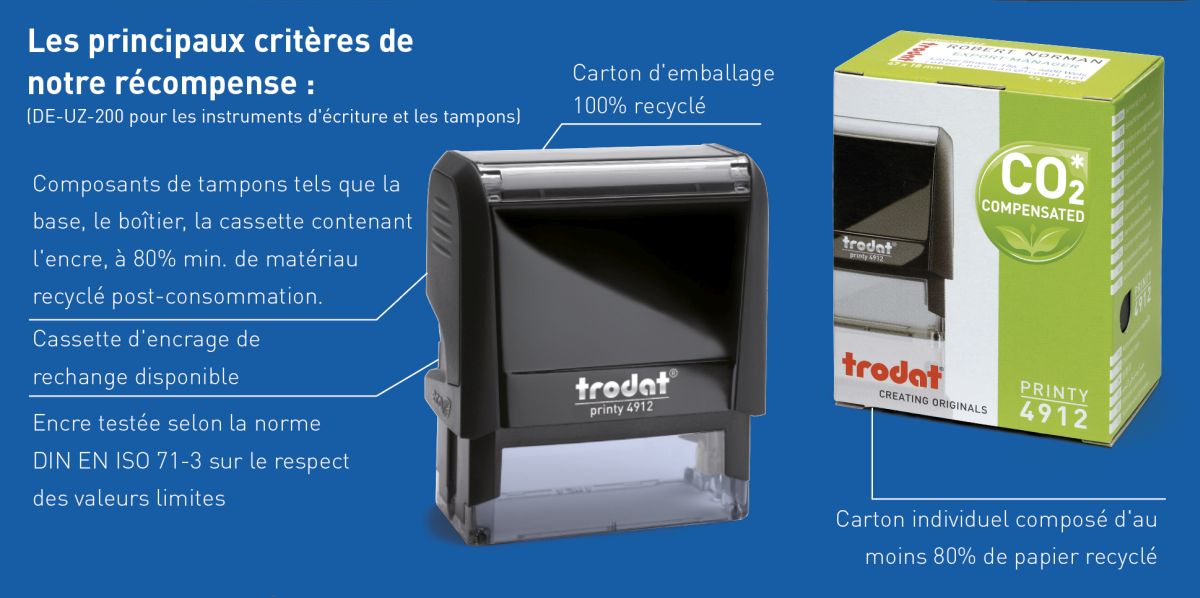 En tant que premier fabricant de tampons, nous avons reçu à la mi-octobre le label écologique "Ange bleu", bien connu et important en Europe, pour les modèles originaux Trodat Printy 4.0 4910, 4911, 4912, 4913, 4914 et 4915 (éco-noir et éco-gris avec cartouche d'encre noire) !